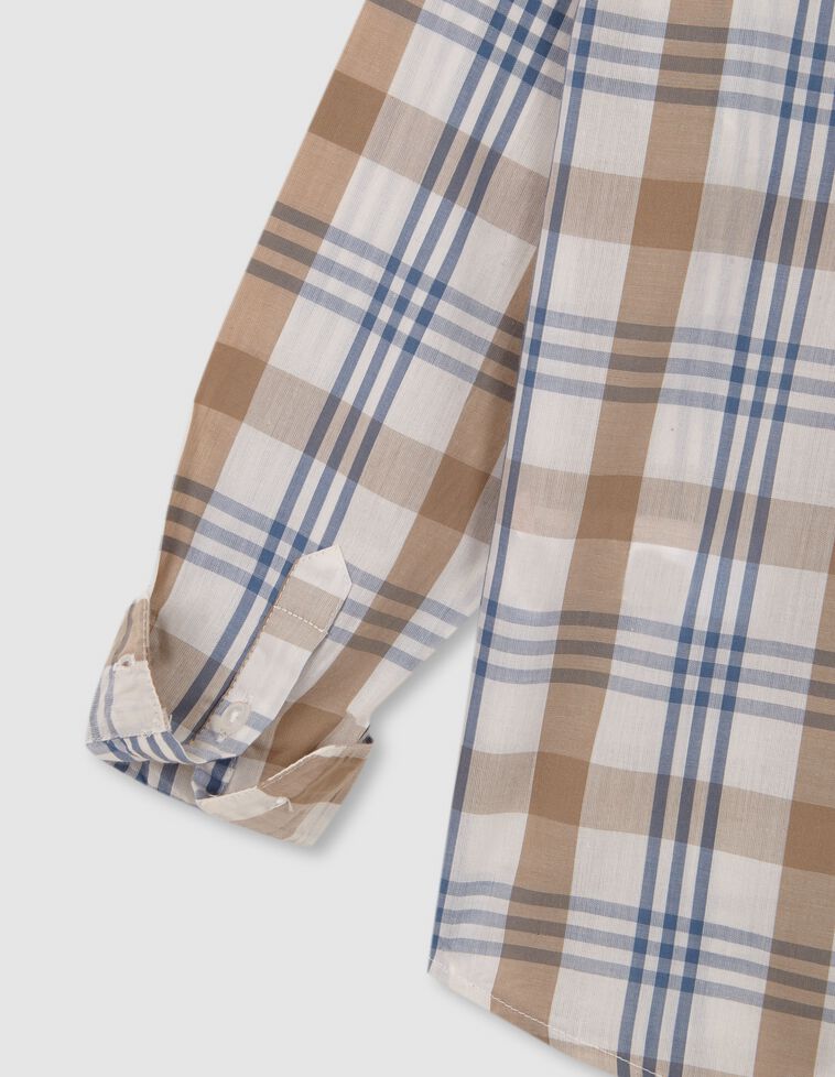 Chemise col normal à carreaux bleus et camel sur fond blanc